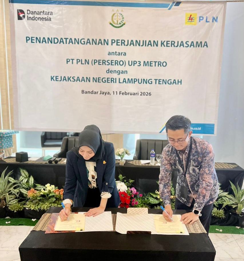 Bandar Jaya 27 Februari 2026 – PT PLN (Persero) Unit Pelaksana Pelayanan Pelanggan (UP3) Metro dan Kejaksaan Negeri Lampung Tengah resmi menandatangani Perjanjian Kerja Sama (PKS) di BBC Hotel Lampung, Bandar Jaya, Rabu (11/02). Kesepakatan ini menjadi momentum penguatan sinergi dalam bidang Perdata dan Tata Usaha Negara guna mendukung kepastian hukum dan tata kelola perusahaan yang baik.